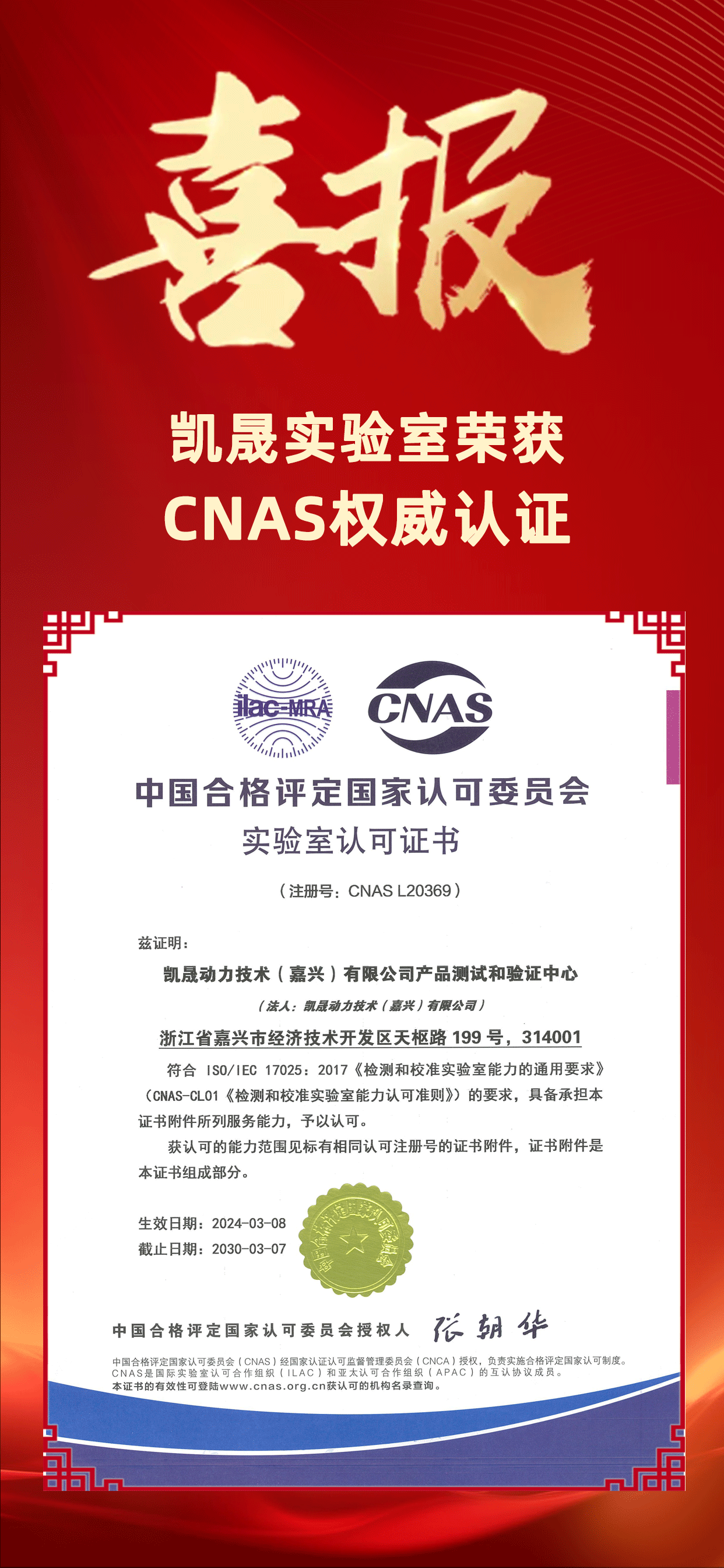 CNAS是國內(nèi)唯一一家進行實驗室認(rèn)可的權(quán)威組織機構(gòu),是國際實驗室認(rèn)可合作組織(ILAC)和亞太認(rèn)可合作組織(APAC)的互認(rèn)協(xié)議成員,在國際認(rèn)可互認(rèn)體系中有著重要的地位,可實現(xiàn)“一個認(rèn)證,多方認(rèn)可”。此次CNAS證書的正式頒布,助力凱晟動力技術(shù)(嘉興)有限公司實驗室成功躋身國家實驗室認(rèn)可行列,發(fā)布的檢測報告不僅在國內(nèi)互認(rèn),在全球100多個國家和地區(qū)也得到認(rèn)可,大大提升了企業(yè)產(chǎn)品在國內(nèi)外市場的競爭力和公信力,推動產(chǎn)品和服務(wù)走向世界。