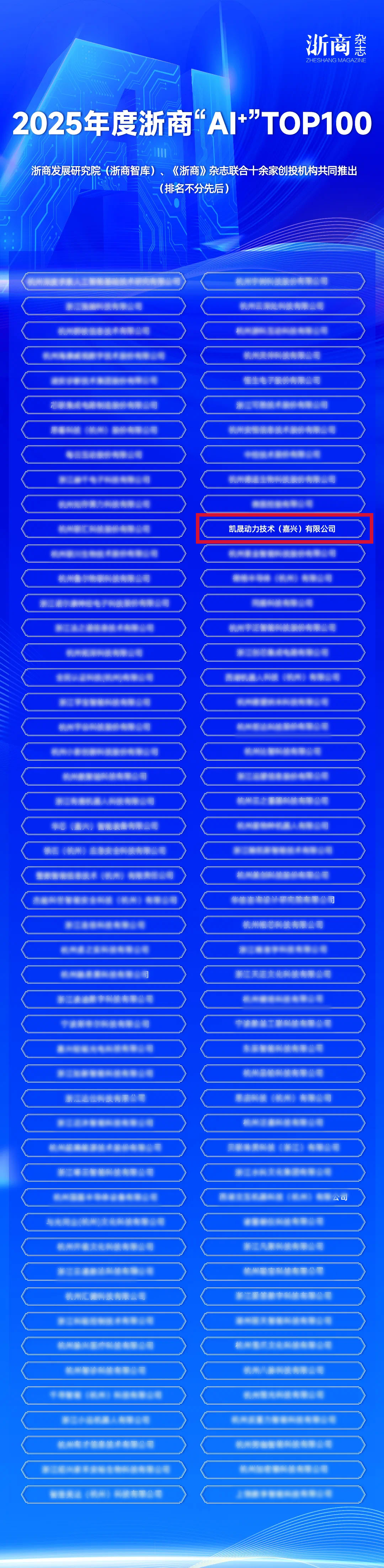 經(jīng)權(quán)威專家評(píng)審團(tuán)的嚴(yán)格評(píng)估與篩選,凱晟動(dòng)力技術(shù)(嘉興)有限公司(以下簡(jiǎn)稱"凱晟")憑借在“AI+”領(lǐng)域的卓越創(chuàng)新與突出貢獻(xiàn),成功榮獲“2025 年度浙商‘AI+’TOP100”榮譽(yù)稱號(hào)。